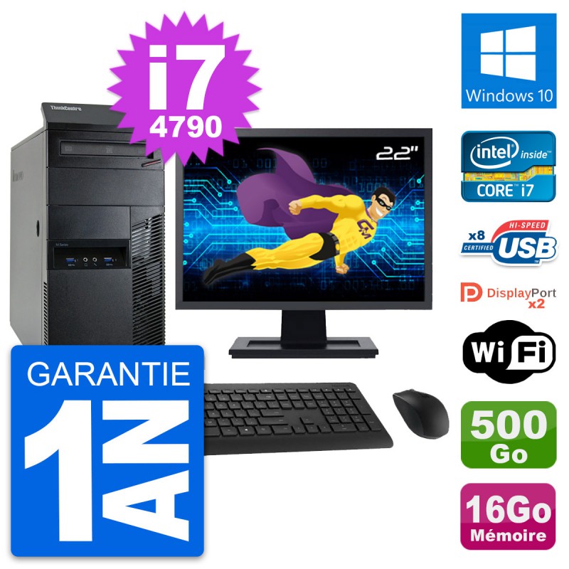 PC Tour Lenovo ThinkCentre M93p MT - Intel Core i7-4790 3.6 Ghz (8 Mo) - 16 Go DDR3 - Disque Dur 3,5" 500 Go - Graveur DVD - Clef Wifi USB - Windows 10 - Livré avec Ecran 22" + clavier + souris (Marques et modèles variables) - Garantie 1 an.