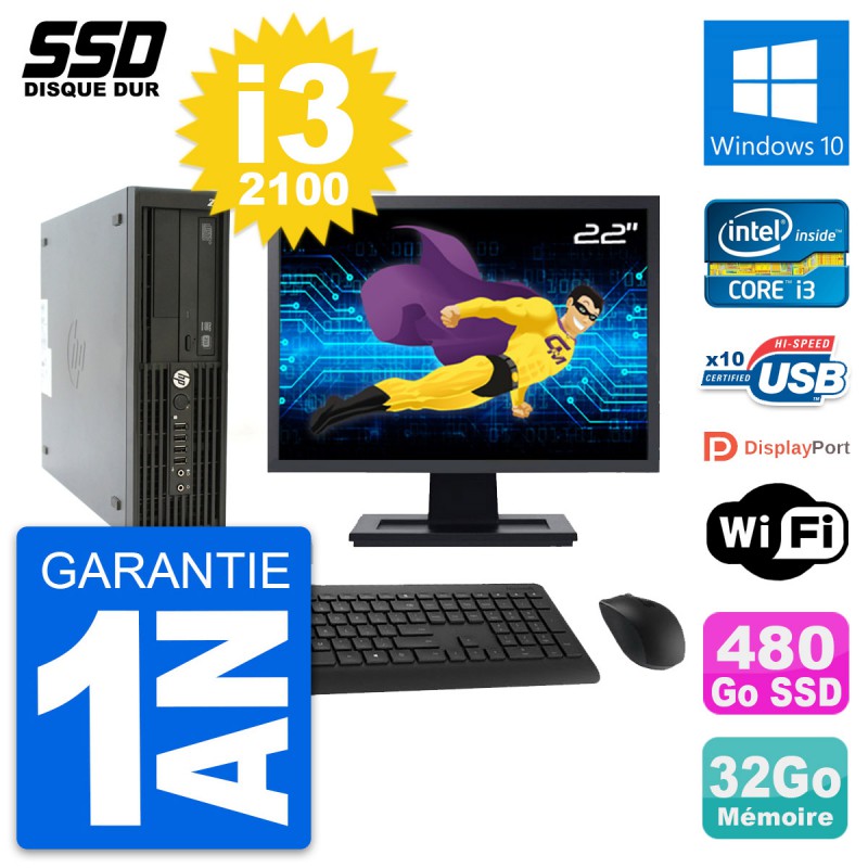 PC HP Z210 SFF Ecran 22" Intel Core i3-2100 RAM 32Go SSD 480Go Windows 10 Wifi