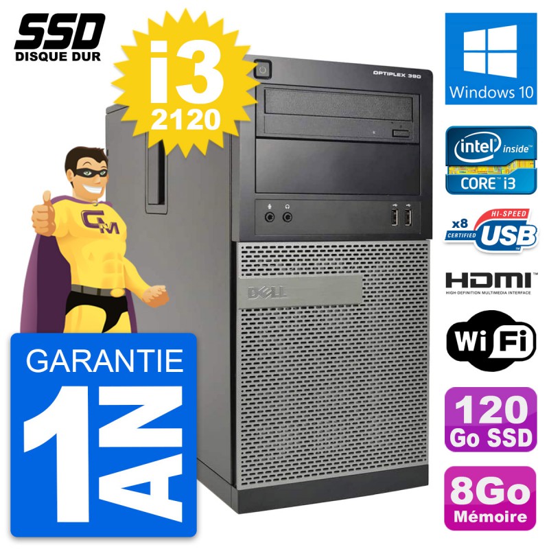 PC Tour Dell OptiPlex 390 MT Core i3-2120 RAM 8Go SSD 120Go HDMI Windows 10 Wifi