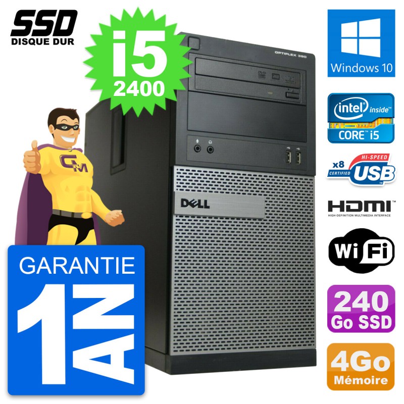 PC Tour Dell OptiPlex 390 - Intel Core i5-2400 3.1 Ghz (6 Mo) - 4 Go DDR3 - Disque Dur SSD 240 Go - Graveur DVD - Clef Wifi USB - Windows 10 - Garantie 1 an.