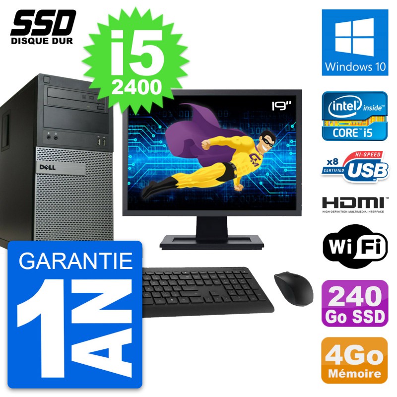 PC Tour Dell 390 - Intel Core i5-2400 3.1 Ghz (6 Mo) - 4 Go DDR3 - Disque Dur SSD 240 Go - Graveur DVD - Clef Wifi USB - Windows 10 - Livré avec Ecran 19" + clavier + souris (Marques et modèles variables) - Garantie 1 an.
