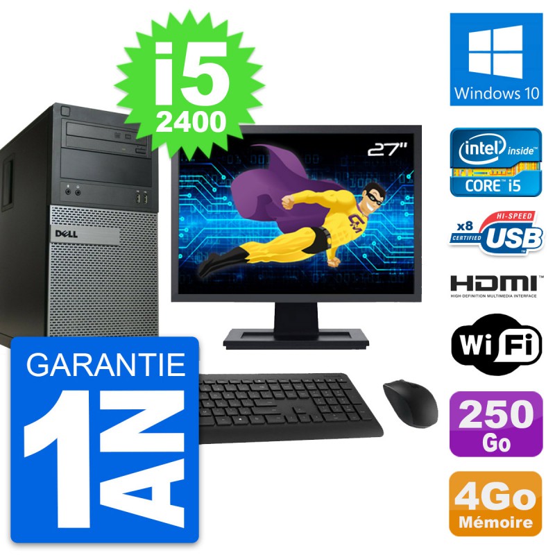 PC Tour Dell 390 - Intel Core i5-2400 3.1 Ghz (6 Mo) - 4 Go DDR3 - Disque Dur 3,5" 250 Go - Graveur DVD - Clef Wifi USB - Windows 10 - Livré avec Ecran 27" + clavier + souris (Marques et modèles variables) - Garantie 1 an.