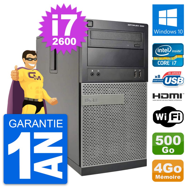 PC Tour Dell OptiPlex 390 - Intel Core i7-2600 3.4 Ghz (8 Mo) - 4 Go DDR3 - Disque Dur 3,5" 500 Go - Graveur DVD - Clef Wifi USB - Windows 10 - Garantie 1 an.