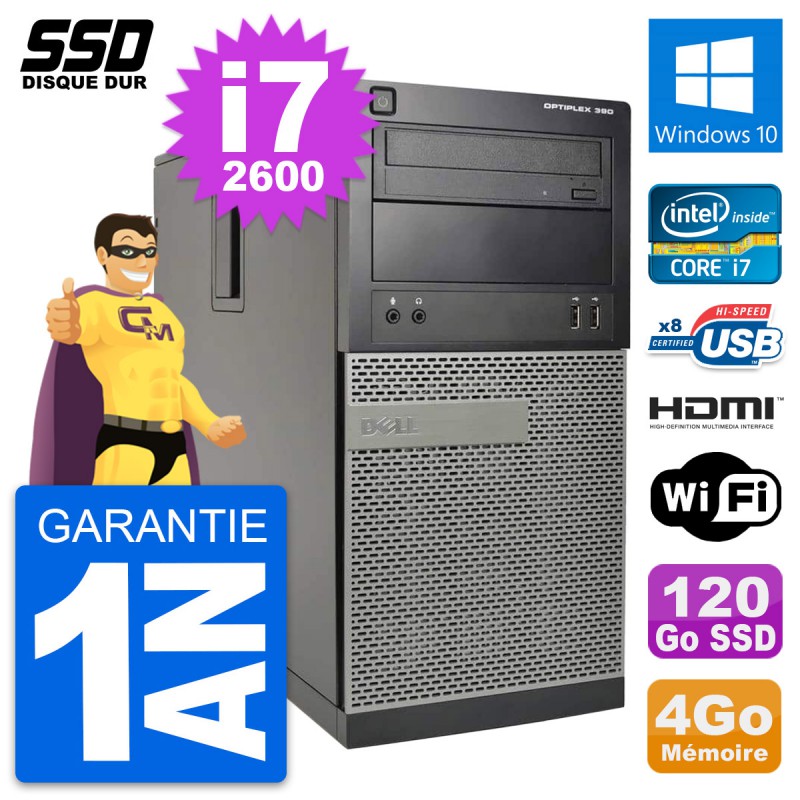 PC Tour Dell OptiPlex 390 - Intel Core i7-2600 3.4 Ghz (8 Mo) - 4 Go DDR3 - Disque Dur SSD 120 Go - Graveur DVD - Clef Wifi USB - Windows 10 - Garantie 1 an.