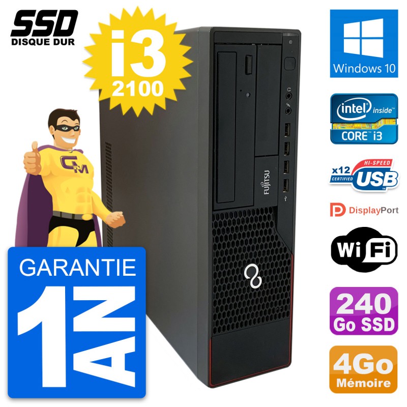 PC Fujitsu Esprimo E910 DT - Intel Core i3-2100 3.1 Ghz (3 Mo) - 4 Go DDR3 - Disque Dur SSD 240 Go - Graveur DVD - Clef Wifi USB - Windows 10 - Garantie 1 an.
