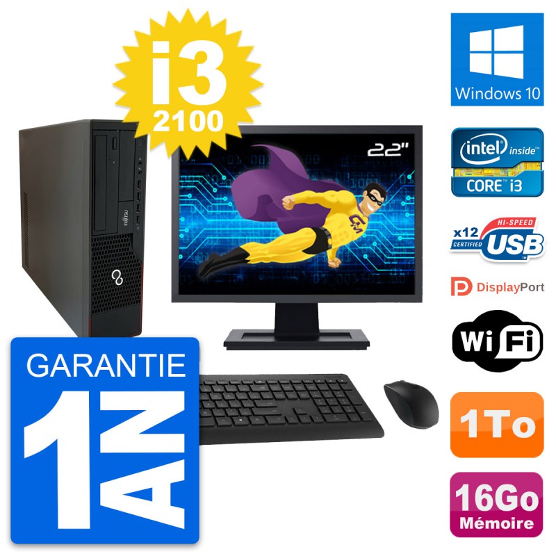 PC Fujitsu E910 DT - Intel Core i3-2100 3.1 Ghz (3 Mo) - 16 Go DDR3 - Disque Dur 3,5" 1 To - Graveur DVD - Clef Wifi USB - Windows 10 - Livré avec Ecran 22" + clavier + souris (Marques et modèles variables) - Garantie 1 an.