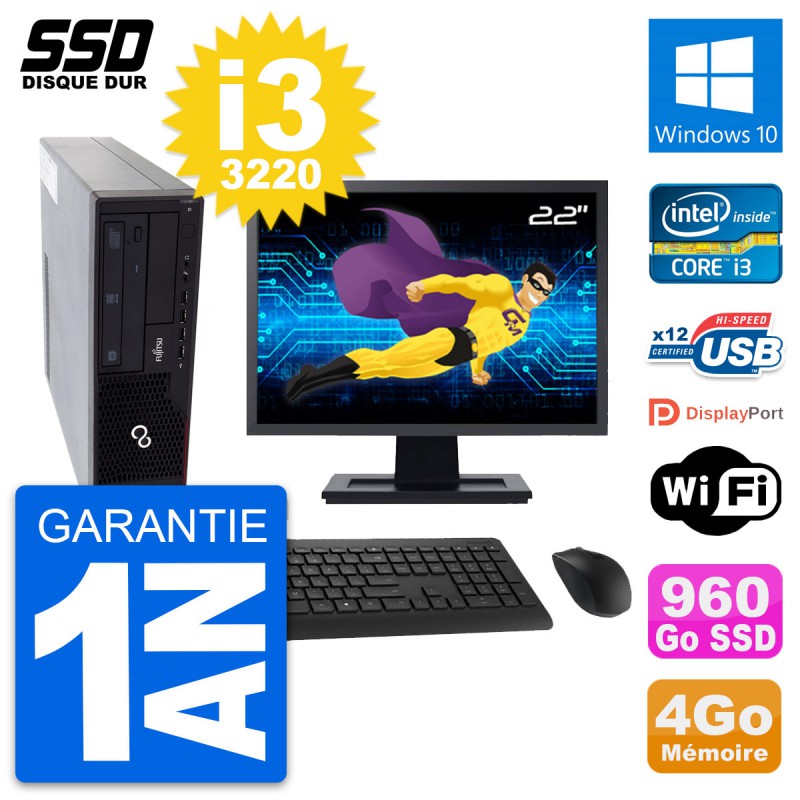 PC Fujitsu E910 DT - Intel Core i3-3220 3.3 Ghz (3 Mo) - 4 Go DDR3 - Disque Dur SSD 960 Go - Graveur DVD - Clef Wifi USB - Windows 10 - Livré avec Ecran 22" + clavier + souris (Marques et modèles variables) - Garantie 1 an.