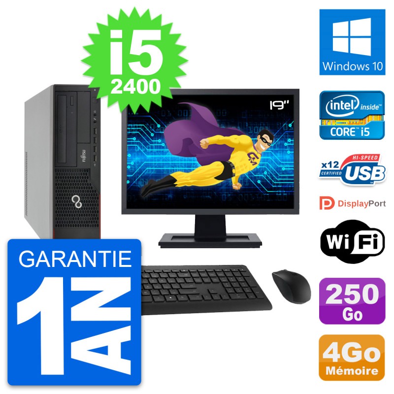 PC Fujitsu E910 DT - Intel Core i5-2400 3.1 Ghz (6 Mo) - 4 Go DDR3 - Disque Dur 3,5" 250 Go - Graveur DVD - Clef Wifi USB - Windows 10 - Livré avec Ecran 19" + clavier + souris (Marques et modèles variables) - Garantie 1 an.
