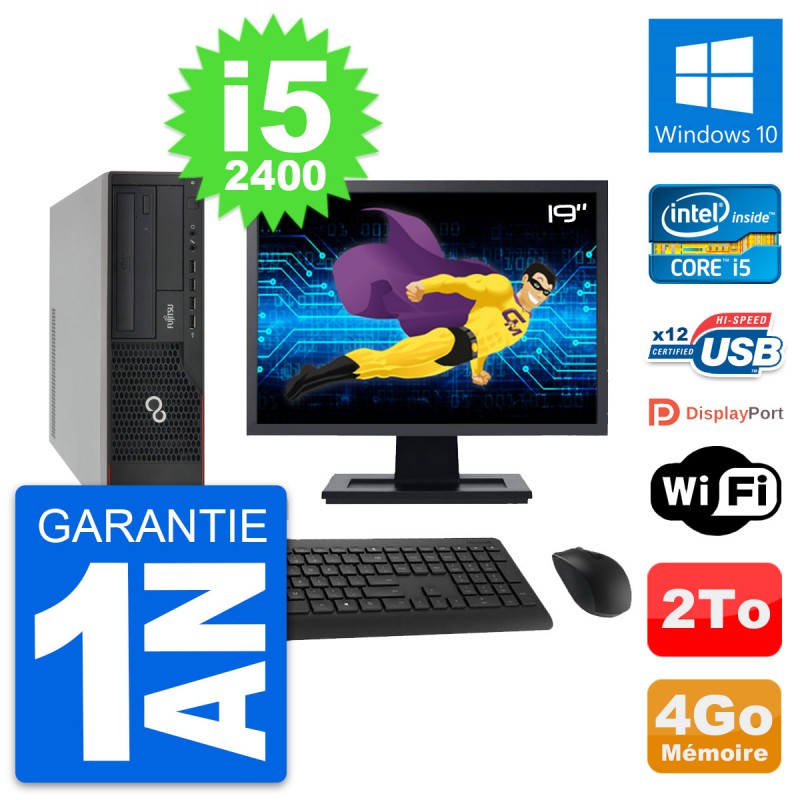 PC Fujitsu E910 DT - Intel Core i5-2400 3.1 Ghz (6 Mo) - 4 Go DDR3 - Disque Dur 3,5" 2 To - Graveur DVD - Clef Wifi USB - Windows 10 - Livré avec Ecran 19" + clavier + souris (Marques et modèles variables) - Garantie 1 an.