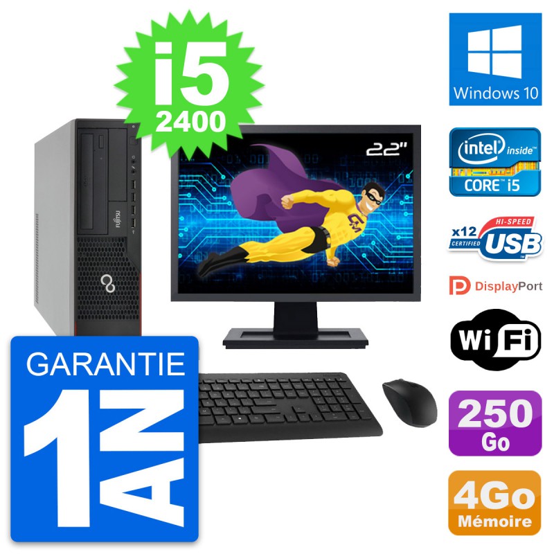 PC Fujitsu E910 DT - Intel Core i5-2400 3.1 Ghz (6 Mo) - 4 Go DDR3 - Disque Dur 3,5" 250 Go - Graveur DVD - Clef Wifi USB - Windows 10 - Livré avec Ecran 22" + clavier + souris (Marques et modèles variables) - Garantie 1 an.