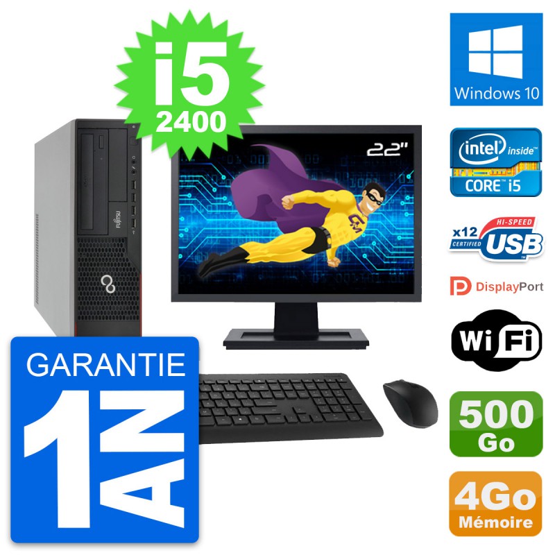 PC Fujitsu E910 DT - Intel Core i5-2400 3.1 Ghz (6 Mo) - 4 Go DDR3 - Disque Dur 3,5" 500 Go - Graveur DVD - Clef Wifi USB - Windows 10 - Livré avec Ecran 22" + clavier + souris (Marques et modèles variables) - Garantie 1 an.