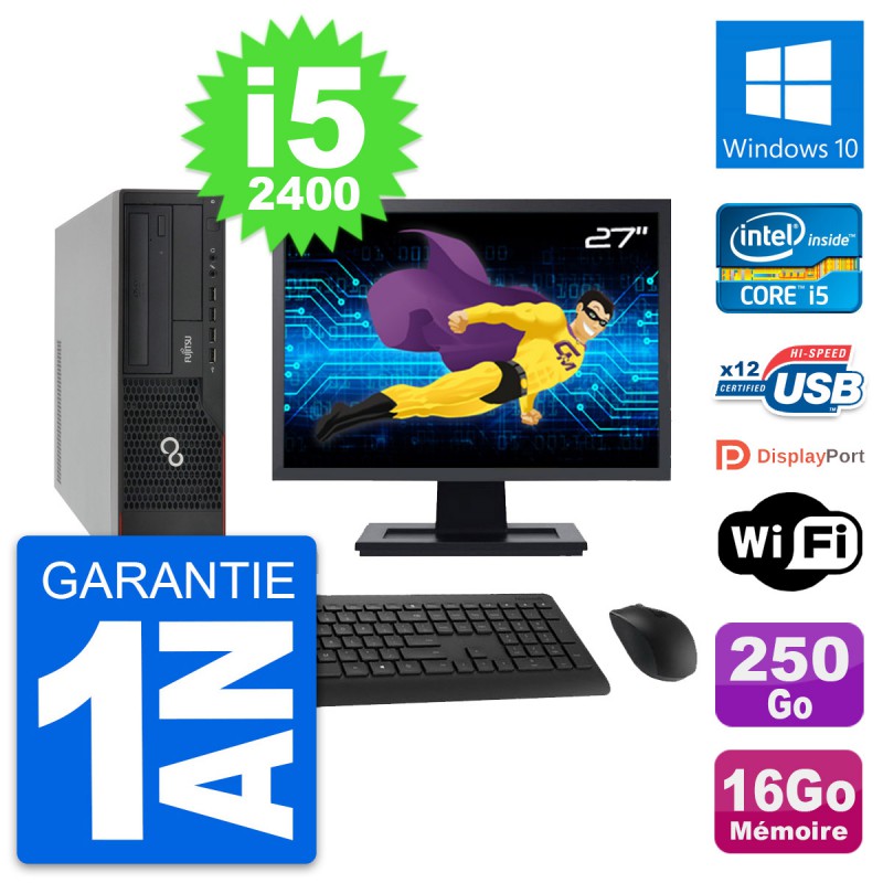 PC Fujitsu E910 DT - Intel Core i5-2400 3.1 Ghz (6 Mo) - 16 Go DDR3 - Disque Dur 3,5" 250 Go - Graveur DVD - Clef Wifi USB - Windows 10 - Livré avec Ecran 27" + clavier + souris (Marques et modèles variables) - Garantie 1 an.