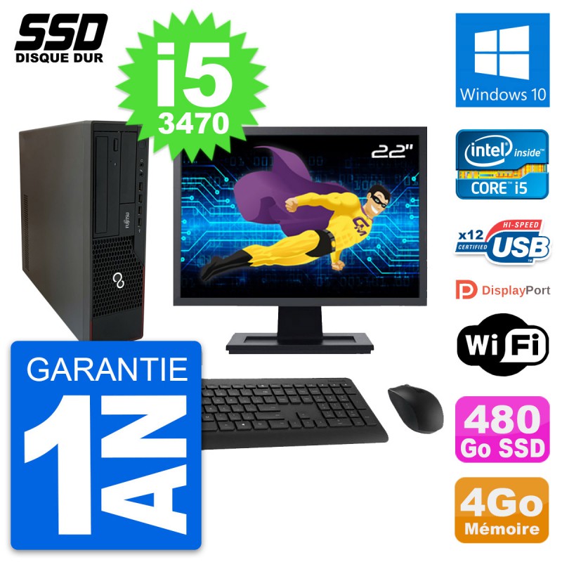 PC Fujitsu E910 DT - Intel Core i5-3470 3.2 Ghz (6 Mo) - 4 Go DDR3 - Disque Dur SSD 480 Go - Graveur DVD - Clef Wifi USB - Windows 10 - Livré avec Ecran 22" + clavier + souris (Marques et modèles variables) - Garantie 1 an.