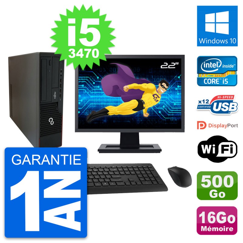PC Fujitsu E910 DT - Intel Core i5-3470 3.2 Ghz (6 Mo) - 16 Go DDR3 - Disque Dur 3,5" 500 Go - Graveur DVD - Clef Wifi USB - Windows 10 - Livré avec Ecran 22" + clavier + souris (Marques et modèles variables) - Garantie 1 an.