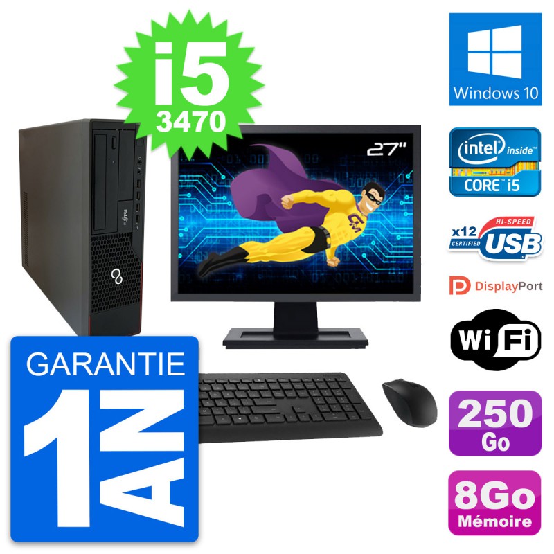 PC Fujitsu E910 DT - Intel Core i5-3470 3.2 Ghz (6 Mo) - 8 Go DDR3 - Disque Dur 3,5" 250 Go - Graveur DVD - Clef Wifi USB - Windows 10 - Livré avec Ecran 27" + clavier + souris (Marques et modèles variables) - Garantie 1 an.