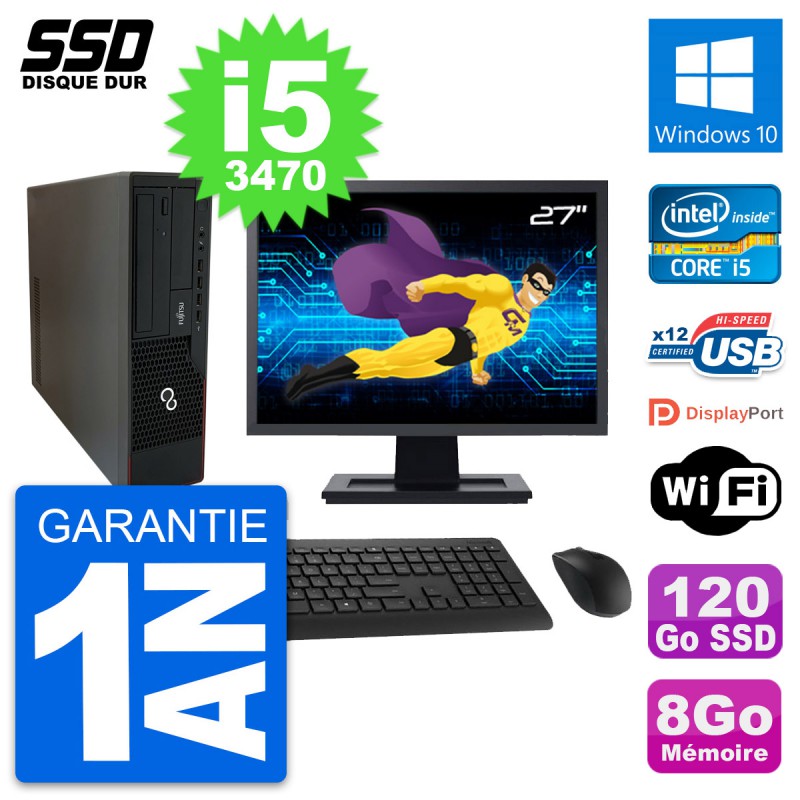 PC Fujitsu E910 DT - Intel Core i5-3470 3.2 Ghz (6 Mo) - 8 Go DDR3 - Disque Dur SSD 120 Go - Graveur DVD - Clef Wifi USB - Windows 10 - Livré avec Ecran 27" + clavier + souris (Marques et modèles variables) - Garantie 1 an.
