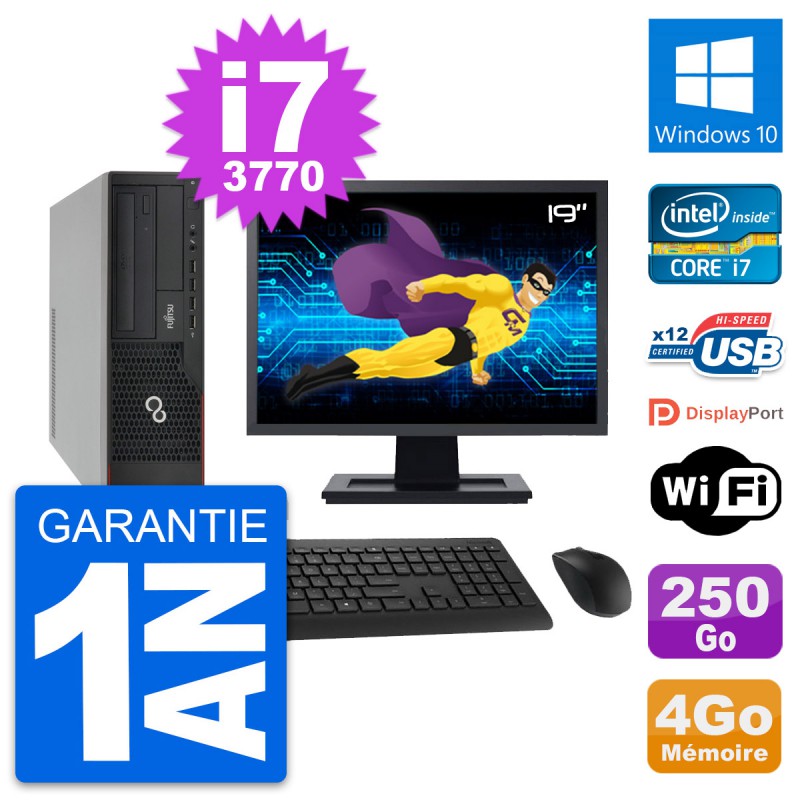 PC Fujitsu E910 DT - Intel Core i7-3770 3.4 Ghz (8 Mo) - 4 Go DDR3 - Disque Dur 3,5" 250 Go - Graveur DVD - Clef Wifi USB - Windows 10 - Livré avec Ecran 19" + clavier + souris (Marques et modèles variables) - Garantie 1 an.