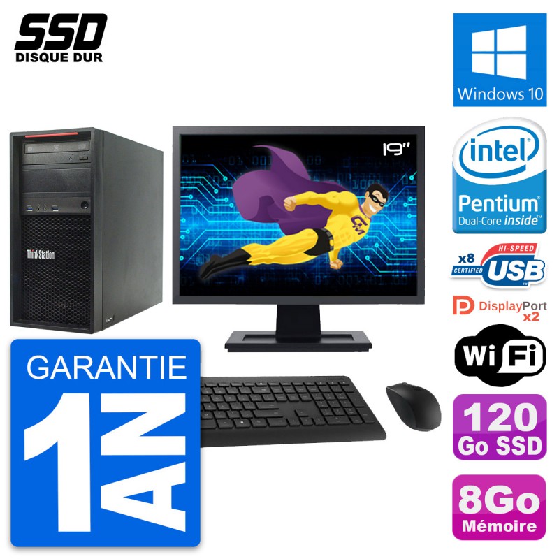 PC Tour Lenovo ThinkStation P300 MT - Intel Pentium G3220 3.0 Ghz (3 Mo) - 8 Go DDR3 - Disque Dur SSD 120 Go - Graveur DVD - Clef Wifi USB - Windows 10 - Livré avec Ecran 19" + clavier + souris (Marques et modèles variables) - Garantie 1 an.