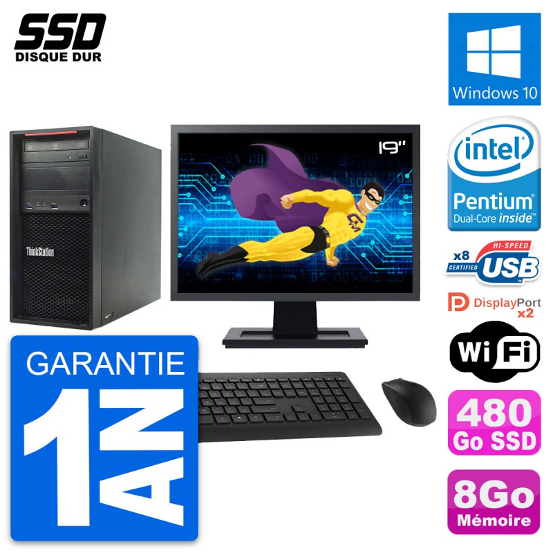 PC Tour Lenovo ThinkStation P300 MT - Intel Pentium G3220 3.0 Ghz (3 Mo) - 8 Go DDR3 - Disque Dur SSD 480 Go - Graveur DVD - Clef Wifi USB - Windows 10 - Livré avec Ecran 19" + clavier + souris (Marques et modèles variables) - Garantie 1 an.