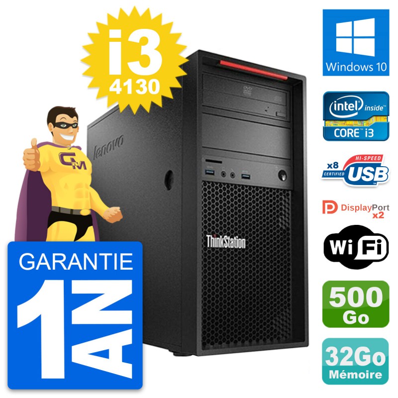 PC Tour Lenovo ThinkStation P300 MT - Intel Core i3-4130 3.4 Ghz (3 Mo) - 32 Go DDR3 - Disque Dur 3,5" 500 Go - Graveur DVD - Clef Wifi USB - Windows 10 - Garantie 1 an.