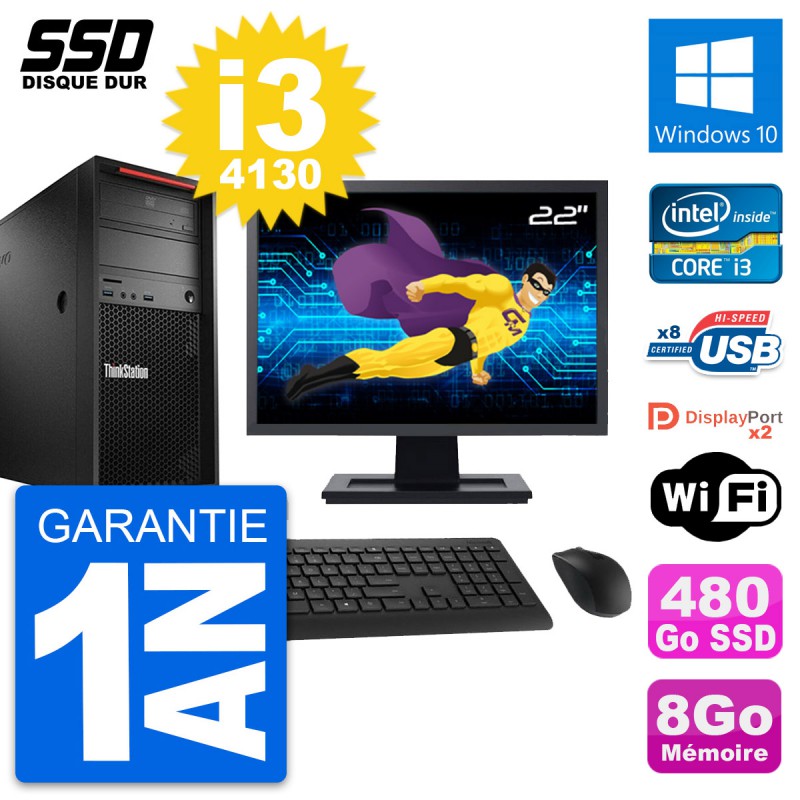 PC Tour Lenovo ThinkStation P300 MT - Intel Core i3-4130 3.4 Ghz (3 Mo) - 8 Go DDR3 - Disque Dur SSD 480 Go - Graveur DVD - Clef Wifi USB - Windows 10 - Livré avec Ecran 22" + clavier + souris (Marques et modèles variables) - Garantie 1 an.