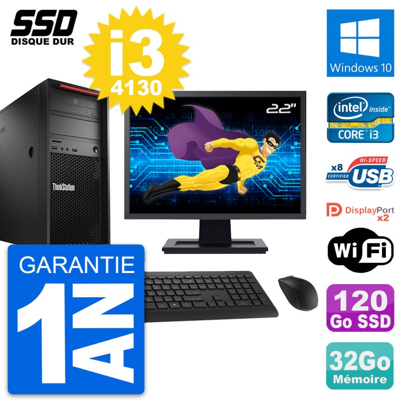 PC Tour Lenovo ThinkStation P300 MT - Intel Core i3-4130 3.4 Ghz (3 Mo) - 32 Go DDR3 - Disque Dur SSD 120 Go - Graveur DVD - Clef Wifi USB - Windows 10 - Livré avec Ecran 22" + clavier + souris (Marques et modèles variables) - Garantie 1 an.