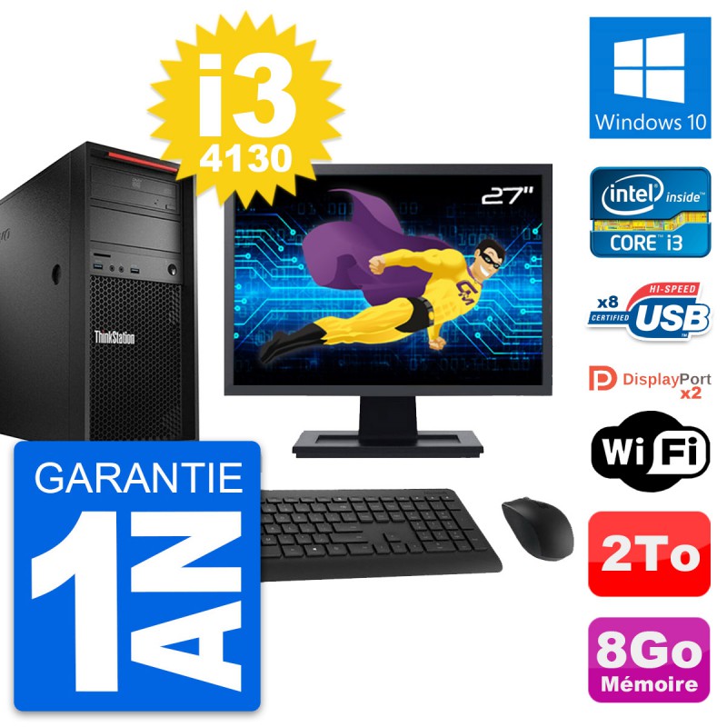 PC Tour Lenovo ThinkStation P300 MT - Intel Core i3-4130 3.4 Ghz (3 Mo) - 8 Go DDR3 - Disque Dur 3,5" 2 To - Graveur DVD - Clef Wifi USB - Windows 10 - Livré avec Ecran 27" + clavier + souris (Marques et modèles variables) - Garantie 1 an.