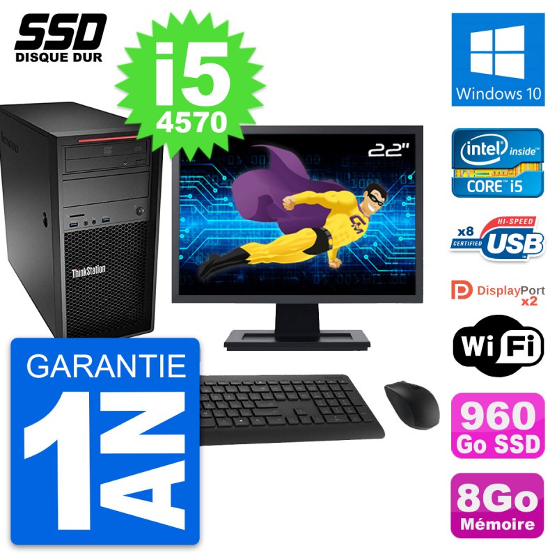 PC Tour Lenovo ThinkStation P300 MT - Intel Core i5-4570 3.2 Ghz (6 Mo) - 8 Go DDR3 - Disque Dur SSD 960 Go - Graveur DVD - Clef Wifi USB - Windows 10 - Livré avec Ecran 22" + clavier + souris (Marques et modèles variables) - Garantie 1 an.