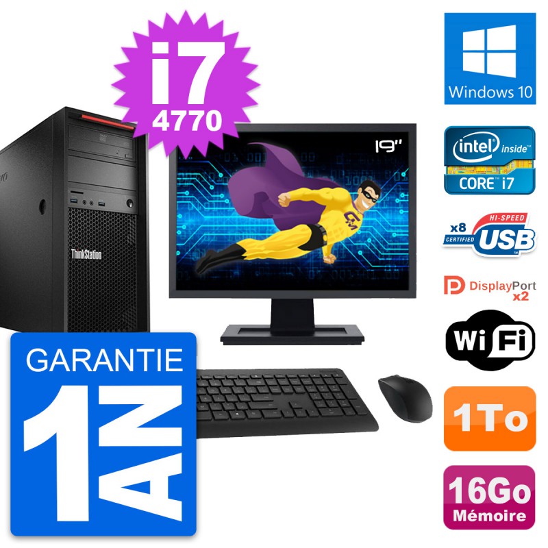 PC Tour Lenovo ThinkStation P300 MT - Intel Core i7-4770 3.4 Ghz (8 Mo) - 16 Go DDR3 - Disque Dur 3,5" 1 To - Graveur DVD - Clef Wifi USB - Windows 10 - Livré avec Ecran 19" + clavier + souris (Marques et modèles variables) - Garantie 1 an.
