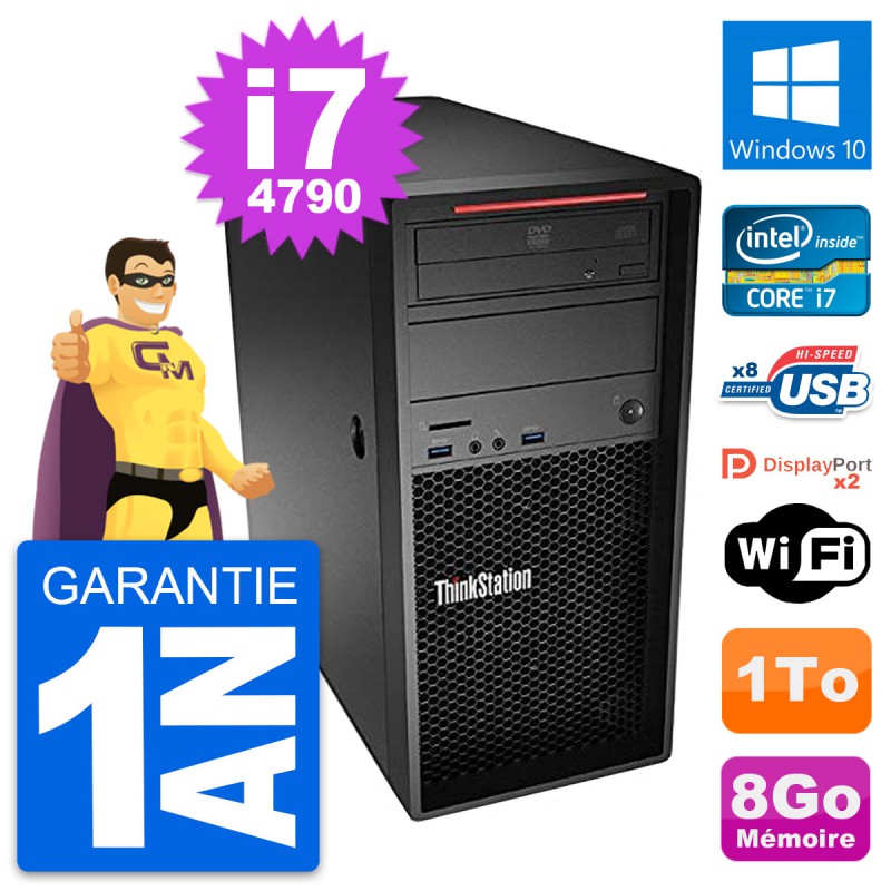 PC Tour Lenovo ThinkStation P300 MT - Intel Core i7-4790 3.6 Ghz (8 Mo) - 8 Go DDR3 - Disque Dur 3,5" 1 To - Graveur DVD - Clef Wifi USB - Windows 10 - Garantie 1 an.