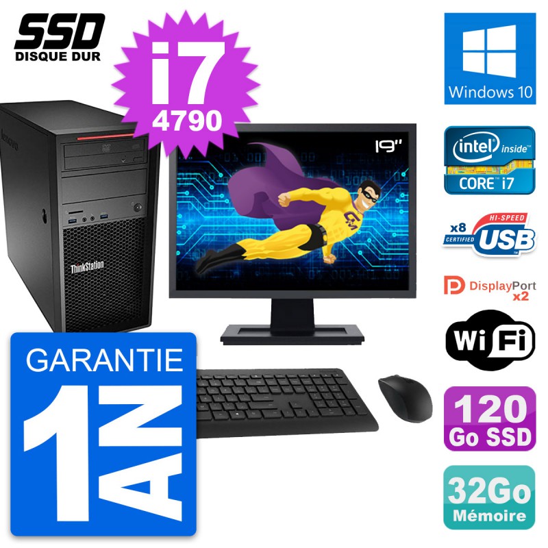 PC Tour Lenovo ThinkStation P300 MT - Intel Core i7-4790 3.6 Ghz (8 Mo) - 32 Go DDR3 - Disque Dur SSD 120 Go - Graveur DVD - Clef Wifi USB - Windows 10 - Livré avec Ecran 19" + clavier + souris (Marques et modèles variables) - Garantie 1 an.