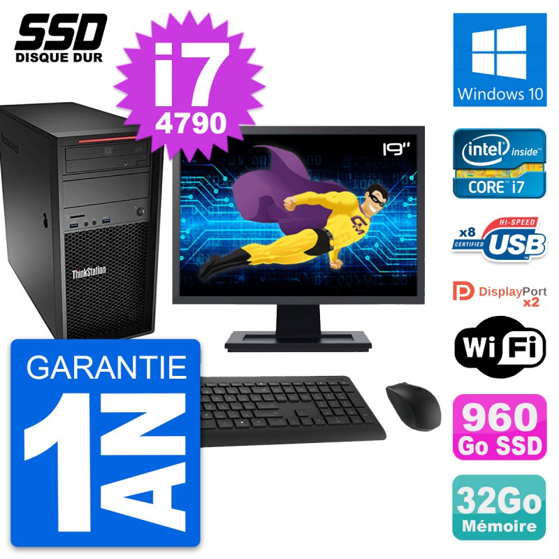 PC Tour Lenovo ThinkStation P300 MT - Intel Core i7-4790 3.6 Ghz (8 Mo) - 32 Go DDR3 - Disque Dur SSD 960 Go - Graveur DVD - Clef Wifi USB - Windows 10 - Livré avec Ecran 19" + clavier + souris (Marques et modèles variables) - Garantie 1 an.