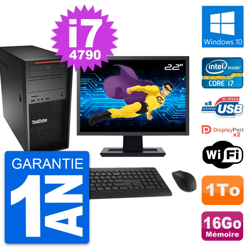 PC Tour Lenovo ThinkStation P300 MT - Intel Core i7-4790 3.6 Ghz (8 Mo) - 16 Go DDR3 - Disque Dur 3,5" 1 To - Graveur DVD - Clef Wifi USB - Windows 10 - Livré avec Ecran 22" + clavier + souris (Marques et modèles variables) - Garantie 1 an.