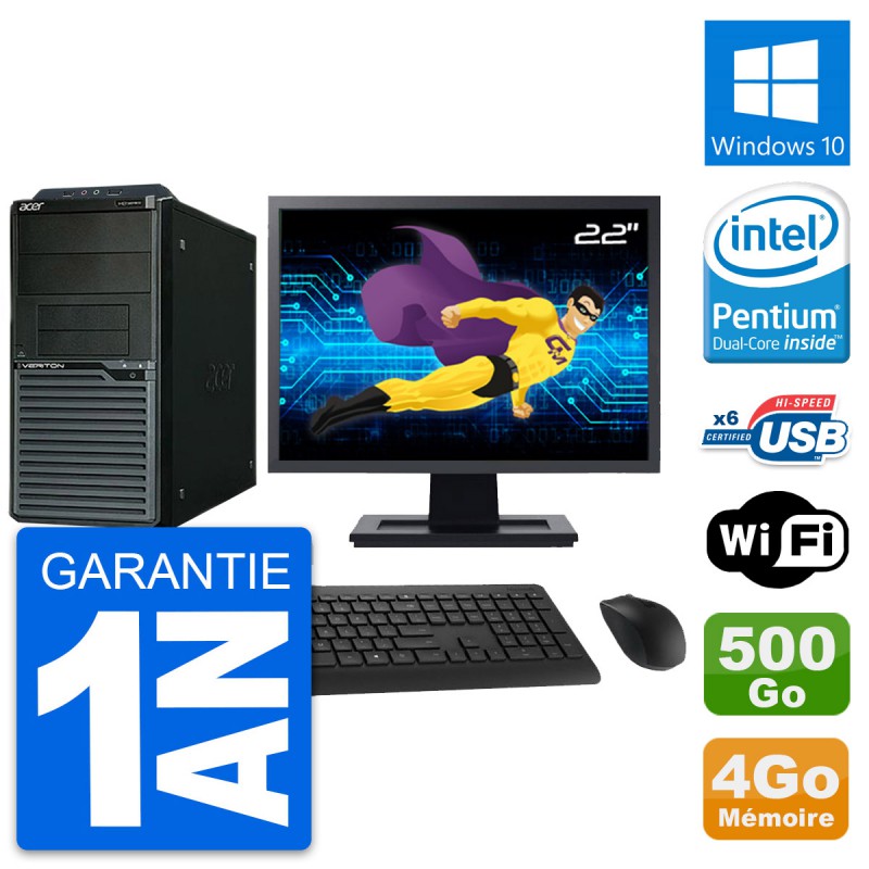 PC Tour Acer M2630G - Intel Pentium Dual-Core G3220 3.0 Ghz (3 Mo) - 4 Go DDR3 - Disque Dur 3,5" 500 Go - Graveur DVD - Clef Wifi USB - Windows 10 - Livré avec Ecran 22" + clavier + souris (Marques et modèles variables) - Garantie 1 an.