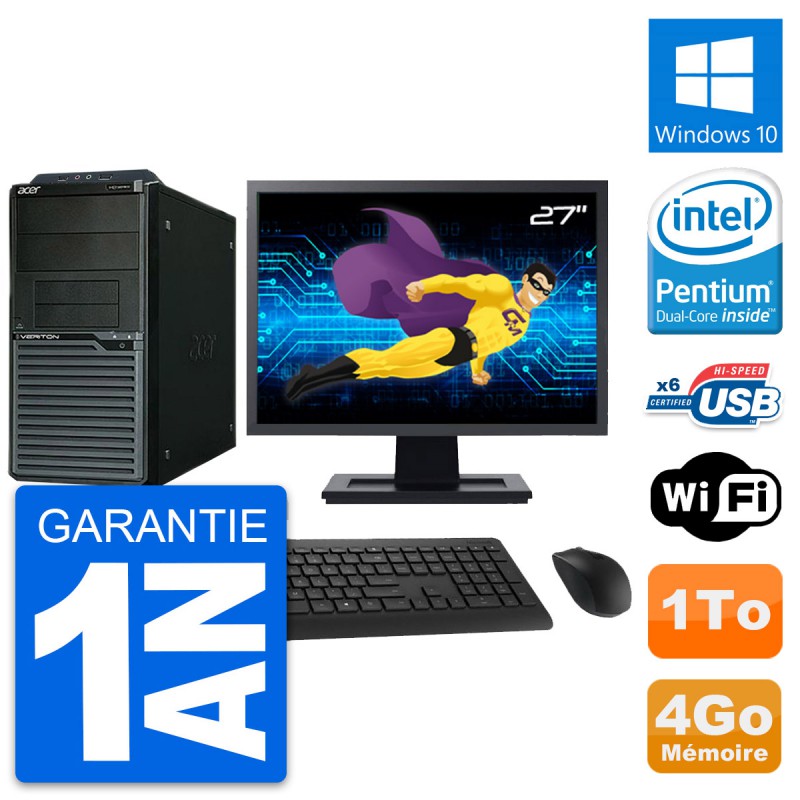 PC Tour Acer M2630G - Intel Pentium Dual-Core G3220 3.0 Ghz (3 Mo) - 4 Go DDR3 - Disque Dur 3,5" 1 To - Graveur DVD - Clef Wifi USB - Windows 10 - Livré avec Ecran 27" + clavier + souris (Marques et modèles variables) - Garantie 1 an.