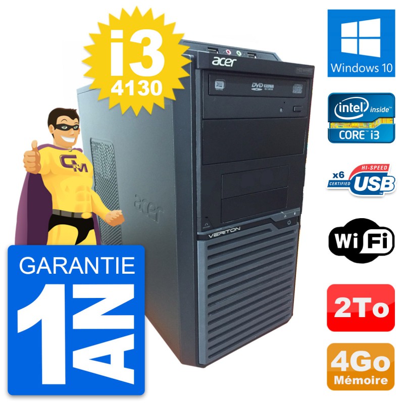 PC Tour Acer Veriton M2630G - Intel Core i3-4130 3.4 Ghz (3 Mo) - 4 Go DDR3 - Disque Dur 3,5" 2 To - Graveur DVD - Clef Wifi USB - Windows 10 - Garantie 1 an.