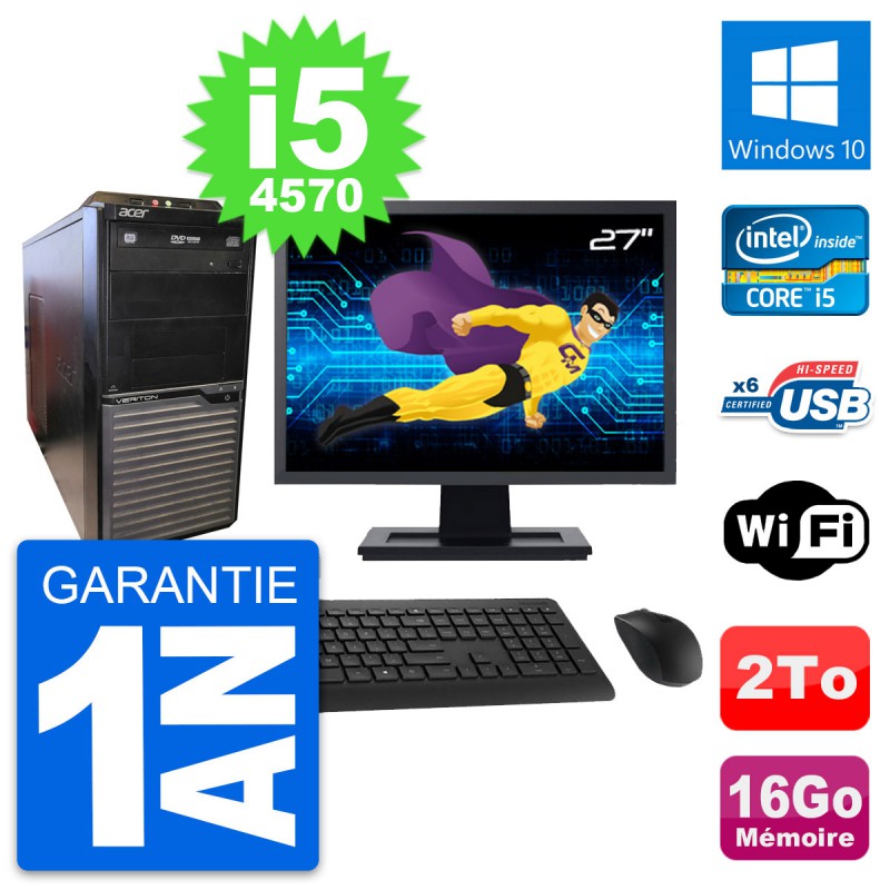 PC Tour Acer M2630G - Intel Core i5-4570 3.2 Ghz (6 Mo) - 16 Go DDR3 - Disque Dur 3,5" 2 To - Graveur DVD - Clef Wifi USB - Windows 10 - Livré avec Ecran 27" + clavier + souris (Marques et modèles variables) - Garantie 1 an.