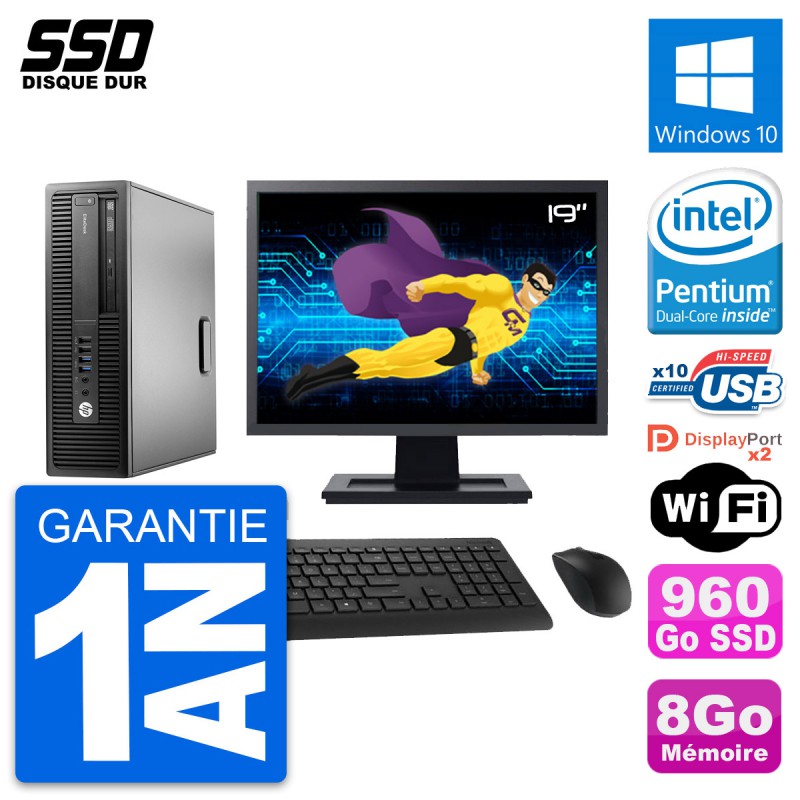 PC HP EliteDesk 800 G2 SFF - Intel Pentium Dual-Core G4400 3.3 Ghz (3 Mo) - 8 Go DDR4 - Disque Dur SSD 960 Go - Graveur DVD - Clef Wifi USB - Windows 10 - Livré avec Ecran 19" + clavier + souris (Marques et modèles variables) - Garantie 1 an.