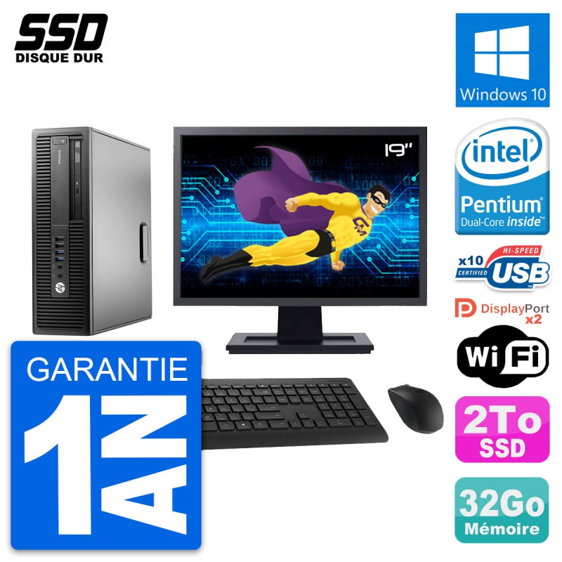 PC HP EliteDesk 800 G2 SFF - Intel Pentium Dual-Core G4400 3.3 Ghz (3 Mo) - 32 Go DDR4 - Disque Dur SSD 2 To - Graveur DVD - Clef Wifi USB - Windows 10 - Livré avec Ecran 19" + clavier + souris (Marques et modèles variables) - Garantie 1 an.