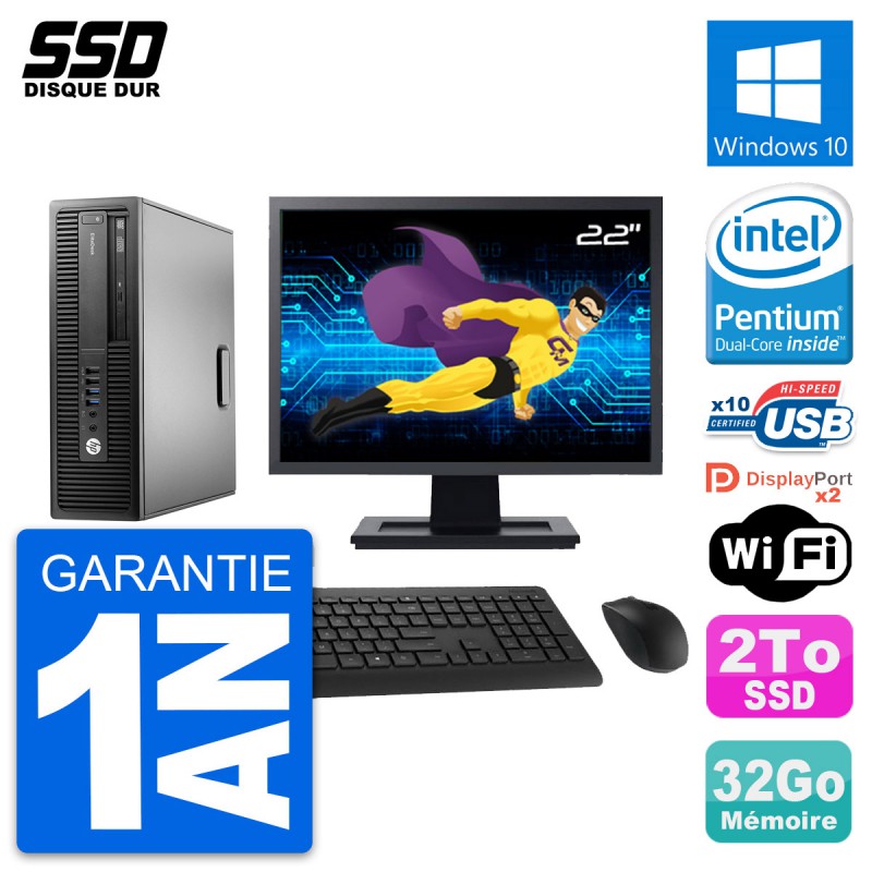 PC HP EliteDesk 800 G2 SFF - Intel Pentium Dual-Core G4400 3.3 Ghz (3 Mo) - 32 Go DDR4 - Disque Dur SSD 2 To - Graveur DVD - Clef Wifi USB - Windows 10 - Livré avec Ecran 22" + clavier + souris (Marques et modèles variables) - Garantie 1 an.