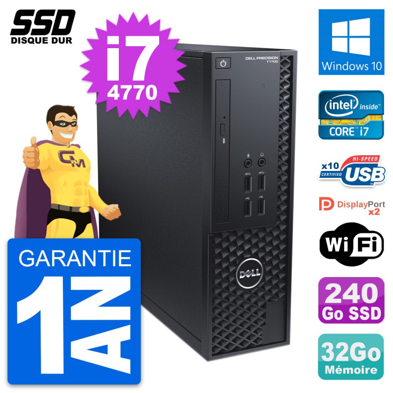 PC Dell Precision T1700 SFF (Slim) - Intel Core i7-4770 3.4 Ghz (8 Mo) - 32 Go DDR3 - SSD 240 Go - Graveur DVD - Clef Wifi USB - Windows 10 - Garantie 1 an.