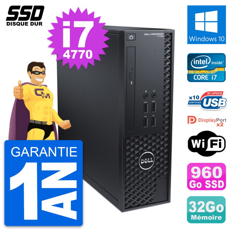 PC Dell Precision T1700 SFF (Slim) - Intel Core i7-4770 3.4 Ghz (8 Mo) - 32 Go DDR3 - SSD 960 Go - Graveur DVD - Clef Wifi USB - Windows 10 - Garantie 1 an.