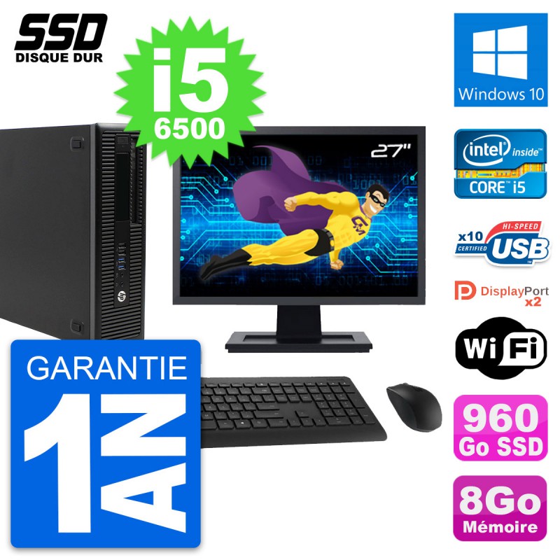 PC HP EliteDesk 800 G2 SFF - Intel Core i5-6500 3.2 Ghz (6 Mo) - 8 Go DDR4 - SSD 960 Go - Graveur DVD - Clef Wifi USB - Windows 10 - Livré avec Ecran 27" + clavier + souris (Marques et modèles variables) - Garantie 1 an.