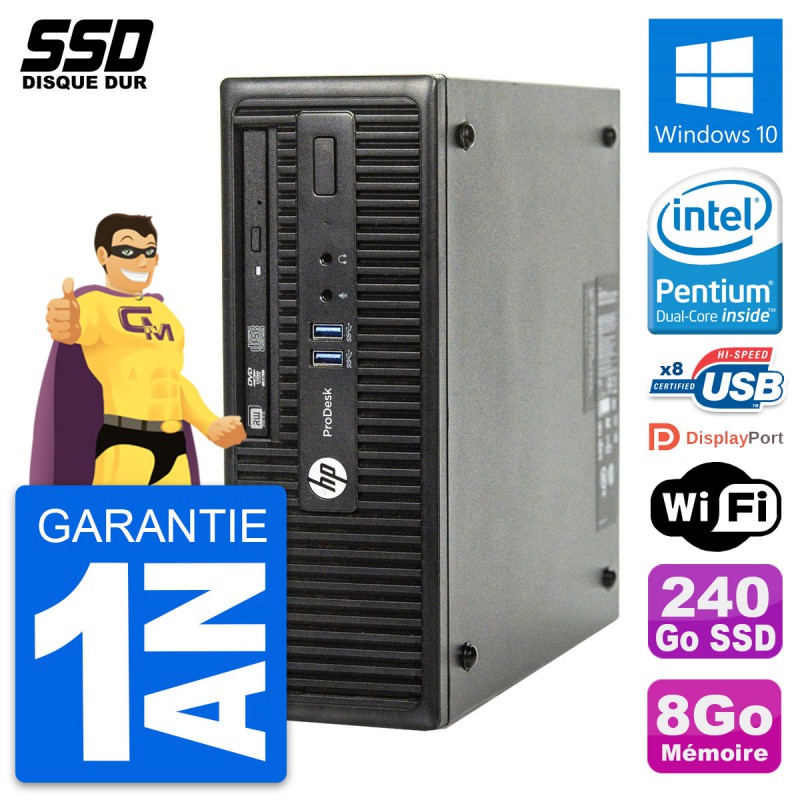 PC HP ProDesk 400 G3 SFF - Intel Pentium Dual-Core G4400 3.3 Ghz (3 Mo) - 8 Go DDR4 - Disque Dur SSD 240 Go - Graveur DVD - Clef Wifi USB - Windows 10 - Garantie 1 an.