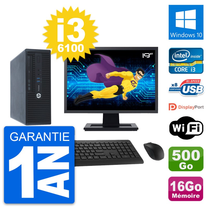 PC HP 400 G3 SFF Ecran 19" Intel i3-6100 RAM 16Go Disque 500Go Windows 10 Wifi