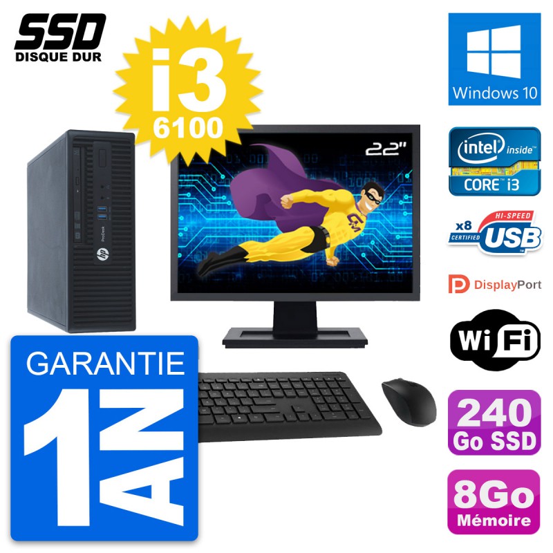 PC HP ProDesk 400 G3 SFF - Intel Core i3-6100 3.7 Ghz (3 Mo) - 8 Go DDR4 - Disque Dur SSD 240 Go - Graveur DVD - Clef Wifi USB - Windows 10 - Livré avec Ecran 22" + clavier + souris (Marques et modèles variables) - Garantie 1 an.