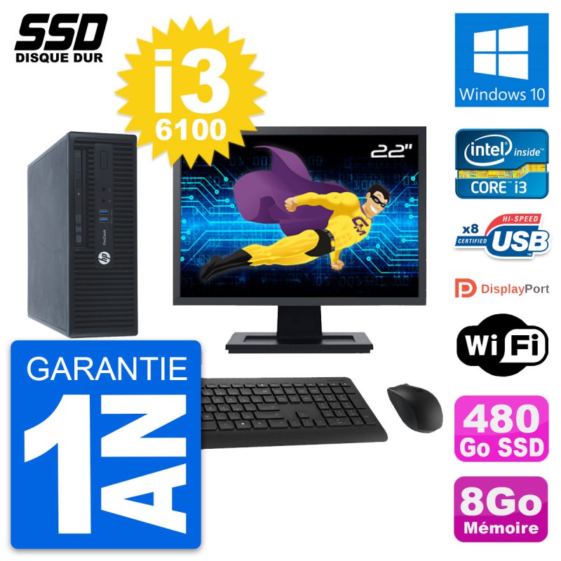 PC HP ProDesk 400 G3 SFF Ecran 22" i3-6100 RAM 8Go SSD 480Go Windows 10 Wifi