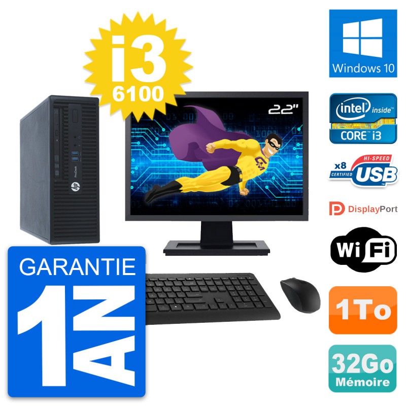 PC HP 400 G3 SFF Ecran 22" Intel i3-6100 RAM 32Go Disque 1To Windows 10 Wifi