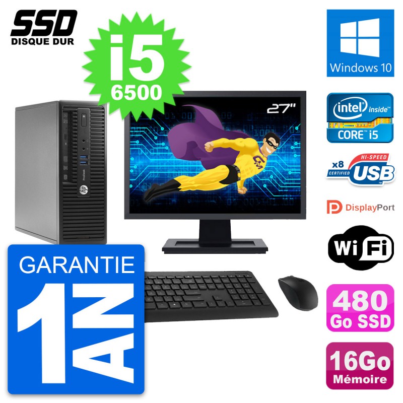 PC HP ProDesk 400 G3 SFF - Intel Core i5-6500 3.2 Ghz (6 Mo) - 16 Go DDR4 - Disque Dur SSD 480 Go - Graveur DVD - Clef Wifi USB - Windows 10 - Livré avec Ecran 27" + clavier + souris (Marques et modèles variables) - Garantie 1 an.