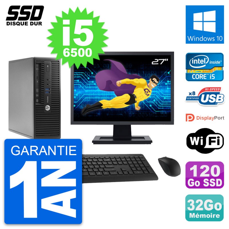 PC HP ProDesk 400 G3 SFF - Intel Core i5-6500 3.2 Ghz (6 Mo) - 32 Go DDR4 - Disque Dur SSD 120 Go - Graveur DVD - Clef Wifi USB - Windows 10 - Livré avec Ecran 27" + clavier + souris (Marques et modèles variables) - Garantie 1 an.